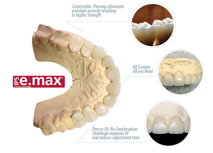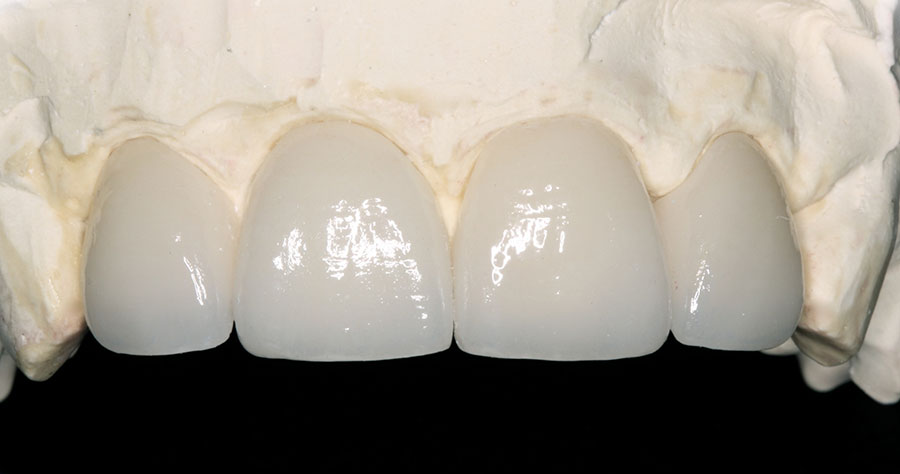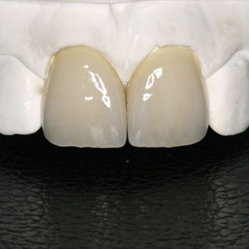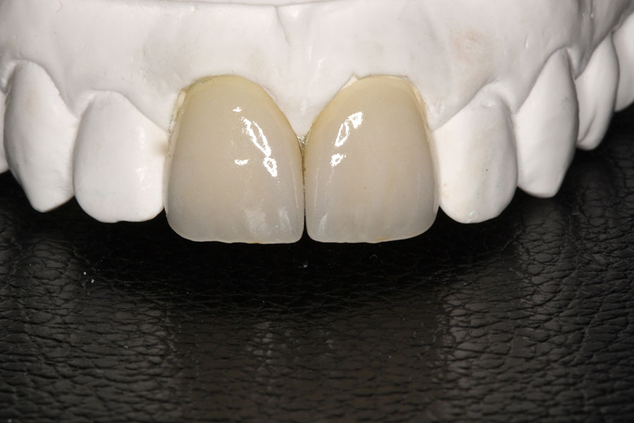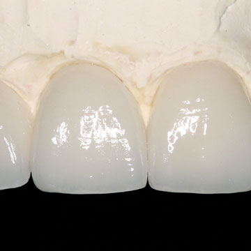 The industrial production process creates absolutely homogeneous ingots in different translucency levels. They demonstrate a strength of 400 MPa. The ingots are pressed to restorations with outstanding accuracy of fit in lvoclar Vivadent press furnaces. The pressed, tooth-colored, highly esthetic restorations are stained and/or veneered with IPS e.max Ceram and glazed.